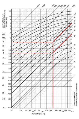 Der Schnittpunkt P1 ergibt sich aus 33 Nm und 2300 min-1 (was einer Richtleistung N = 7,9 kW entspricht).