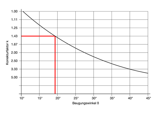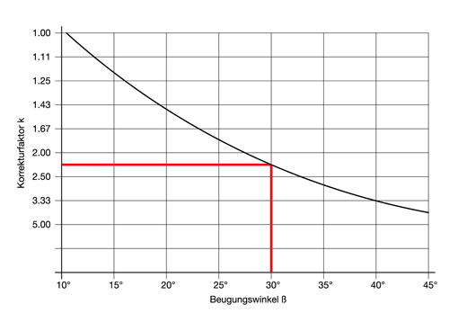 Bei größeren Beugungswinkeln β muss eine um den Korrekturfaktor k vergrößerte, fiktive Richtleistung N bzw. ein fiktives Drehmoment M angesetzt werden (siehe untenstehendes Beispiel).