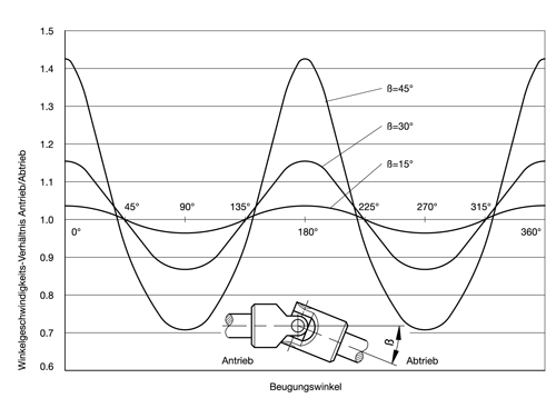Die Einfach-Gelenke übertragen die eingeleitete gleichförmige Bewegung ungleichförmig, da bei einer Umdrehung der treibenden Welle die angetriebene Welle zweimal beschleunigt und zweimal verzögert wird. Die Größe der Ungleichförmigkeit ist abhängig vom Arbeitswinkel β.