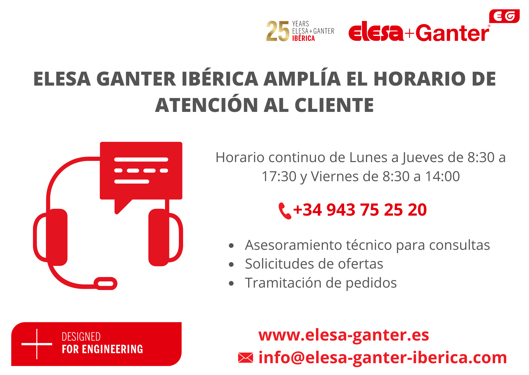 Elesa+Ganter Ibérica da un paso más y amplía su servicio de atención al cliente para hacerlo continuo, de lunes a jueves de 8:30 a 17:30 y viernes de 8:30 a 14:00, para ofrecer una atención personalizada a sus clientes.