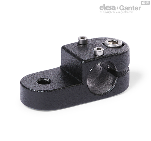 Las abrazaderas articuladas para actuadores lineales GN 277.1 se basan en conectores articulados para actuadores. Los orificios de montaje provistos adicionalmente se usan para conectar la tuerca deslizante de un actuador lineal. Los orificios con la designación G están equipados con cojinetes de deslizamiento.