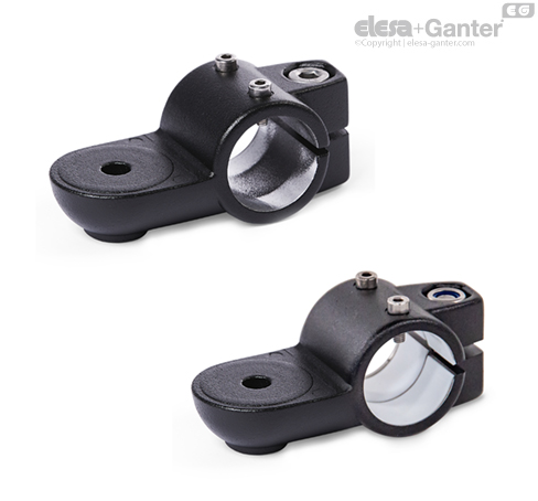 Las abrazaderas articuladas para actuadores lineales GN 278.1 se basan en abrazaderas articuladas para actuadores. Los orificios de montaje provistos adicionalmente se usan para conectar la tuerca deslizante de un actuador lineal. Los orificios con la designación G están equipados con cojinetes de deslizamiento.