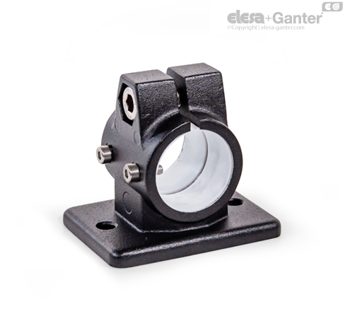Las abrazaderas para actuadores lineales con bridas GN 146.13 se basan en abrazaderas para conectores con bridas. Los orificios de montaje provistos adicionalmente se usan para conectar la tuerca deslizante de un actuador lineal. Los orificios con la designación G están equipados con cojinetes de deslizamiento.