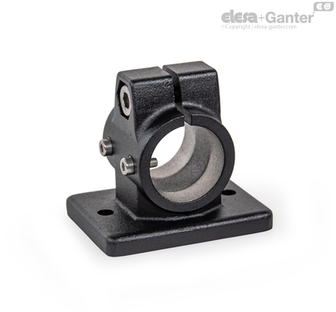 Las abrazaderas para actuadores lineales con bridas GN 146.13 se basan en abrazaderas para conectores con bridas. Los orificios de montaje provistos adicionalmente se usan para conectar la tuerca deslizante de un actuador lineal. Los orificios con la designación G están equipados con cojinetes de deslizamiento.