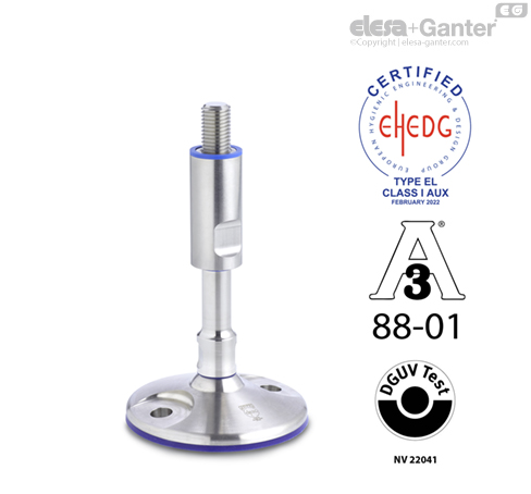 Los pies de nivelación GN 20 sin agujeros de montaje cumplen las normas 88-01 sanitarias 3-A y los principios del test DGUV, lo que los convierte en adecuados para su uso en areas higiénicas. Los pies de nivelación GN 20 con agujeros de montaje cumplen las normas EHEDG, las 88-01 sanitarias 3-A y los principios del test DGUV, lo que los convierte en extremádamente adecuados para su uso en areas higiénicas.