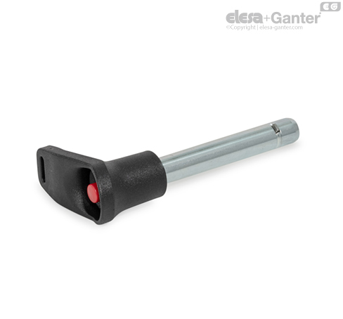 Las aletas rectangulares de chapa de acero inoxidable mantienen el pasador de fijación en una posición axial en el orificio. Se retraen por medio del pulsador y cuando se liberan, el muelle de compresión las devuelve a la posición bloqueada. Las aletas no están alineadas con la empuñadura en L.