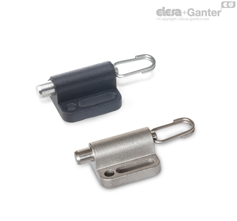 Los pernos de retención GN 417 con brida se montan en paralelo a los pasadores y se caracterizan por su altura especialmente baja. El patrón de orificios de montaje con ranuras ofrece amplias opciones de ajuste, por ejemplo, para el uso de perfiles de aluminio. El uso de arandelas facilita el montaje de las piezas utilizando las ranuras.