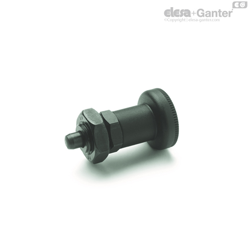 Los posicionadores de muelle con posición de bloqueo GN 607.1 se utilizan en aplicaciones en las que el pivote debe mantenerse en posición retraída. Para lograr esto, se gira el mando 90º después de retraerlo. Una muesca mantiene el posicionador en esta posición.