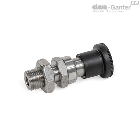 Los posicionadores de muelle GN 824 cuentan con un pivote de retención con una sección transversal cuadrada, una superficie de cierre en un lateral y un chaflán en la otra. Cuando el objeto que se quiera sujetar se mueve hacia el chaflán, el pivote de retención retrocede hasta la guía, lo que permite que las ranuras y los bordes pasen por encima del pivote. El pivote de retención se engancha automáticamente en su lugar cuando se mueve hacia la superficie de enganche. El cierre se puede liberar tirando del pomo.