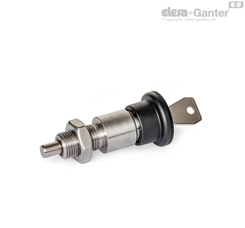 Los posicionadores de acero inoxidable bloqueables GN 814 se utilizan para aplicaciones en las que hay que prevenir un uso no autorizado. Los tipos A y AK fijan el pivote del posicionador en la posición frontal después del bloqueo. Los tipos E y EK fijan el pivote del posicionador en la posición posterior si no tiene que sobresalir temporalmente.