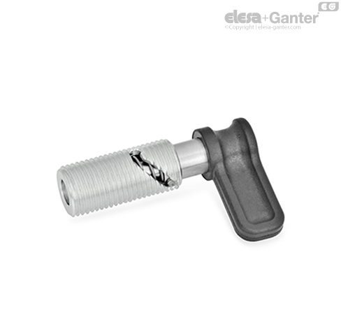 Los pestillos de retención GN 712.1 se usan en aplicaciones en las que el pasador de retención no deba sobresalir temporalmente. l girar la palanca respectivamente 90º o 120º en sentido antihorario, el pivote se mueve a través de la abertura curva que se encuentra en el cuerpo. Después, el pasador de retención sobresale.