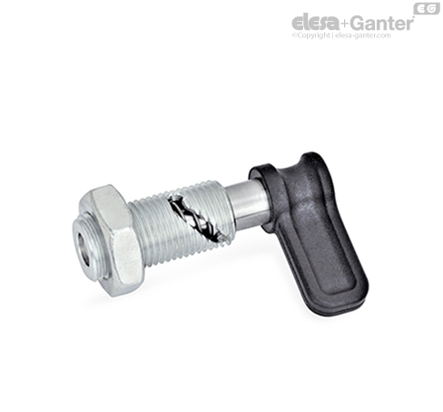 Los pestillos de retención GN 712.1 se usan en aplicaciones en las que el pasador de retención no deba sobresalir temporalmente. l girar la palanca respectivamente 90º o 120º en sentido antihorario, el pivote se mueve a través de la abertura curva que se encuentra en el cuerpo. Después, el pasador de retención sobresale.