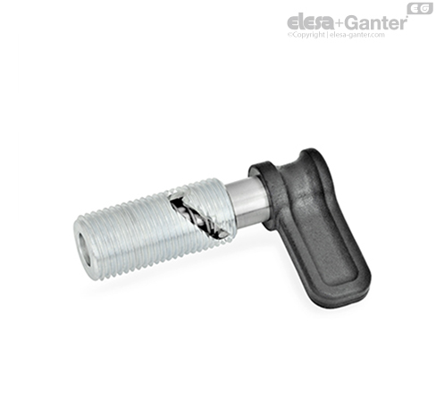 Los pestillos de retención GN 712.1 se usan en aplicaciones en las que el pasador de retención no deba sobresalir temporalmente. l girar la palanca respectivamente 90º o 120º en sentido antihorario, el pivote se mueve a través de la abertura curva que se encuentra en el cuerpo. Después, el pasador de retención sobresale.