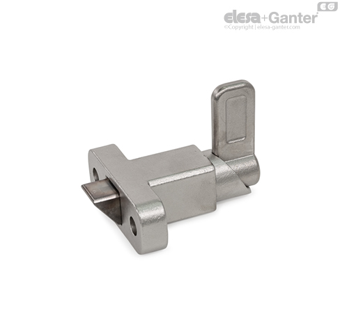Los posicionadores de muelle GN 724.2 cuentan con un pivote de retención con una sección transversal cuadrada, una superficie de cierre en un lateral y un chaflán en el otro. Cuando el objeto que se quiera sujetar se mueve hacia el chaflán, el pivote de retención retrocede hasta la guía, lo que permite que las ranuras y los bordes pasen por encima del pivote. El pivote de retención se engancha automáticamente en su lugar cuando se mueve hacia la superficie de enganche. El cierre se puede liberar tirando de la leva de cierre.