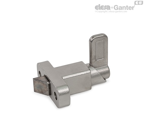 Los posicionadores de muelle GN 724.2 cuentan con un pivote de retención con una sección transversal cuadrada, una superficie de cierre en un lateral y un chaflán en el otro. Cuando el objeto que se quiera sujetar se mueve hacia el chaflán, el pivote de retención retrocede hasta la guía, lo que permite que las ranuras y los bordes pasen por encima del pivote. El pivote de retención se engancha automáticamente en su lugar cuando se mueve hacia la superficie de enganche. El cierre se puede liberar tirando de la leva de cierre.