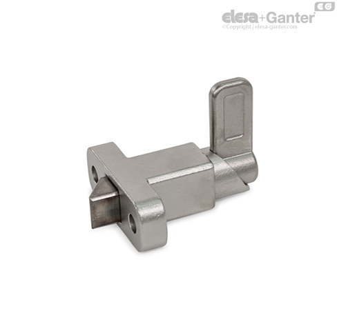 Los posicionadores de muelle GN 724.2 cuentan con un pivote de retención con una sección transversal cuadrada, una superficie de cierre en un lateral y un chaflán en el otro. Cuando el objeto que se quiera sujetar se mueve hacia el chaflán, el pivote de retención retrocede hasta la guía, lo que permite que las ranuras y los bordes pasen por encima del pivote. El pivote de retención se engancha automáticamente en su lugar cuando se mueve hacia la superficie de enganche. El cierre se puede liberar tirando de la leva de cierre.