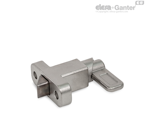 Los posicionadores de muelle GN 724.2 cuentan con un pivote de retención con una sección transversal cuadrada, una superficie de cierre en un lateral y un chaflán en el otro. Cuando el objeto que se quiera sujetar se mueve hacia el chaflán, el pivote de retención retrocede hasta la guía, lo que permite que las ranuras y los bordes pasen por encima del pivote. El pivote de retención se engancha automáticamente en su lugar cuando se mueve hacia la superficie de enganche. El cierre se puede liberar tirando de la leva de cierre.