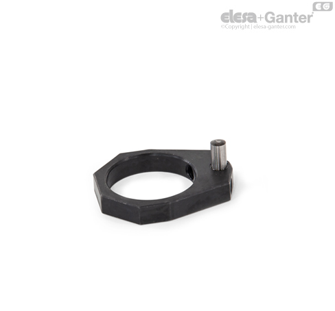 Los anillos de posicionamiento GN 9192.2 limitan la amplitud del giro de los pisadores de apriete GN 9192 a 110° hacia la izquierda o la derecha por medio de un pasador de posicionamiento. La posición del anillo se puede ajustar para asegurar que se alcance la posición de apriete de manera fiable cuando el pisador gira sobre el pasador de posicionamiento.