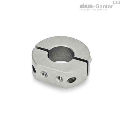 Los agujeros roscados de soporte de los anillos de fijación partidos GN 7072.1 permiten fijar soportes de sensores GN 7062.10 u otros elementos, como levas o manillas de leva, en ejes.