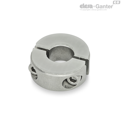 La arandela amortiguadora integrada de los anillos de apriete partidos GN 7072.3 absorbe impactos leves y tiene un efecto insonorizante cuando los anillos de apriete entran en contacto con otros componentes.