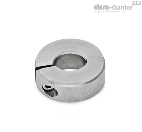 La arandela amortiguadora integrada de los anillos de apriete semipartidos de acero inoxidable GN 7062.3 absorbe impactos leves y tiene un efecto insonorizante cuando los anillos de apriete entran en contacto con otros componentes.