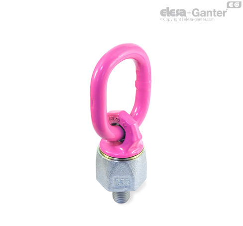Las anillas de carga GN 5860 giran alojadas en cojinetes de bolas. La anilla de rotación libre permite que los pernos puedan soportar cargas en cualquier dirección de tracción.