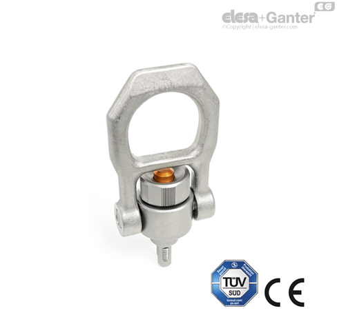 El grillete gira 180º, da la vuelta completa alrededor del pasador y siempre se alinea solo en la dirección de la carga sin hacer que el pasador gire. De esta forma, se evita que el pasador de elevación roscado se desatornille de la rosca y la pieza de trabajo se eleva de manera segura. Una barra de seguridad protege el botón de un uso no intencionado.