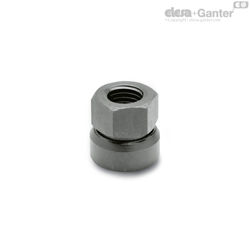 Las tuercas hexagonales con alojamiento esférico GN 347 pueden usarse para bloquear superficies inclinadas hasta 3° sin transmitir la rotación de la tuerca ni alterar la superficie bloqueada.