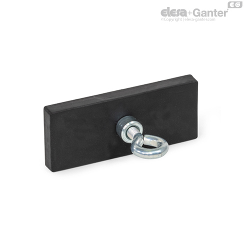 Los imanes con cubierta de caucho GN 57.10 forman un sistema junto con la pieza de acero que protege y refuerza el imán, concentrando el flujo magnético de forma óptima sobre la superficie magnética engomada.