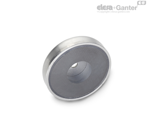 Los imanes de sujeción de acero inoxidable GN 50.45 se combinan con una carcasa de acero inoxidable y un anillo de plástico/anillo de aislamiento en un sistema que protege y refuerza el imán para una transmisión óptima del flujo magnético en la superficie magnética.