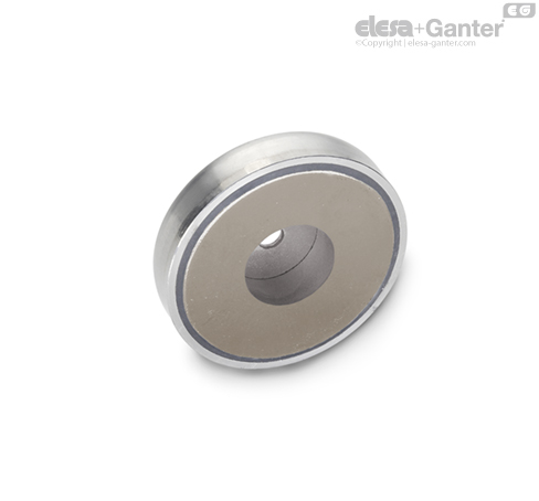 Los imanes de sujeción de acero inoxidable GN 50.45 se combinan con una carcasa de acero inoxidable y un anillo de plástico/anillo de aislamiento en un sistema que protege y refuerza el imán para una transmisión óptima del flujo magnético en la superficie magnética.