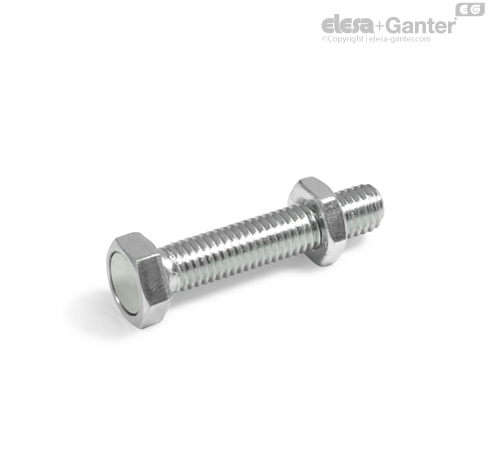 Los tornillos de fijación GN 251.6 con imanes de retención se combinan con un imán con alojamiento de acero en la forma de un tornillo de cabeza hexagonal para crear un sistema que protege y refuerza el imán para una transmisión óptima del flujo magnético en la superficie magnética.