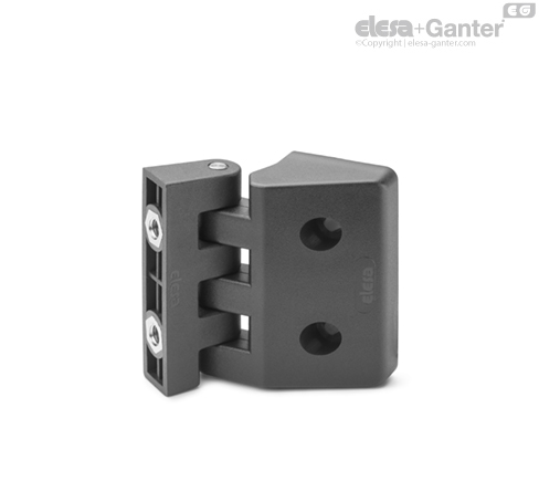 La bisagra está compuesta por dos cuerpos de diferentes dimensiones (uno estrecho y uno de mayor tamaño) y pueden montarse por ejemplo en estructuras con montantes y puertas de espesor delgado.
