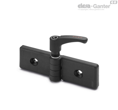 El efecto de fricción se obtiene al bloquear los dos cuerpos de la bisagra mediante la empuñadura regulable especial. Para accionar el mecanismo de ajuste, presionar la empuñadura (PUSH) hacia abajo. Al soltar la palanca, el muelle desembraga el dentado y la empuñadura vuelve a la empuñadura inicial permitiendo que continúe libremente la rotación de la puerta sin obstaculizar las maniobras del operador incluso si se produjeran golpes accidentales. La gran cantidad de dientes dentro de la empuñadura regulable garantiza la posibilidad de rotación incluso cuando el ángulo de maniobra de la palanca se encuentra limitado.
