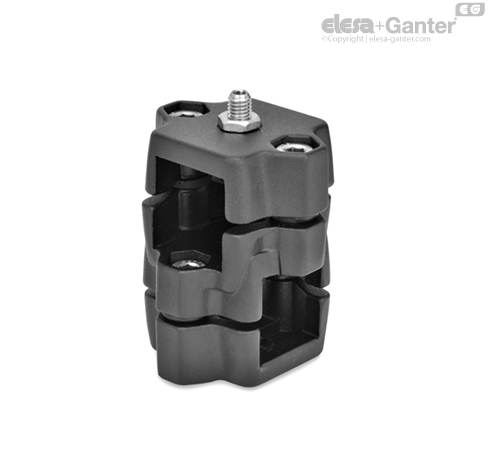 Para una sujeción rápida sin herramientas, es posible reemplazar el tornillo de cabeza hueca hexagonal en las ubicaciones z por empuñaduras ajustables GN 911 que se muestran en la tabla como accesorios. Los casquillos de centrado de los orificios pasantes eliminan el huelgo axial entre las partes superior e inferior de las abrazaderas blocantes.