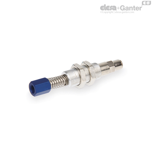 Manguito roscado de aluminio y tuercas hexagonales de latón niquelado.