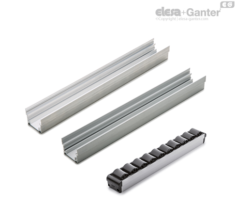 El perfil puede montar 11 elementos de rodadura RLT-U, RLT-U15 o bolas RLS-U. La particular sección del perfil permite el montaje de roldanas y bolas sin la necesidad de tornillos u otros elementos de fijación.