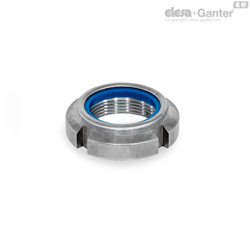 Las tuercas de bloqueo ranuradas GN 1804.1 se autobloquean debido a su inserto de poliamida. También se pueden usar como tuerca de fijación y más de una vez.