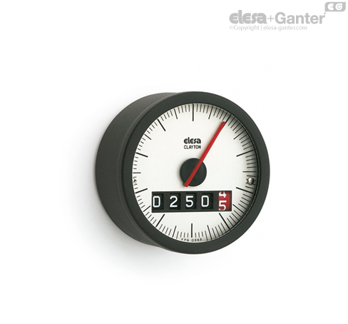 Contador digital de cinco cifras y una aguja roja que gira sobre el cuadrante graduado. La cifra de la rueda roja indica los decimales mientras la aguja indica las centésimas.