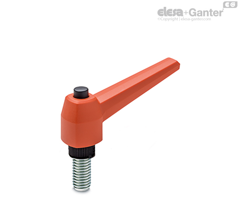 Elemento de fijación en tecnopolímero reforzado con fibra de vidrio con pasador de retención, color negro, con moleteado en la parte saliente para facilitar el enroscado inicial. Muelle de retorno en acero inoxidable AISI 302.
