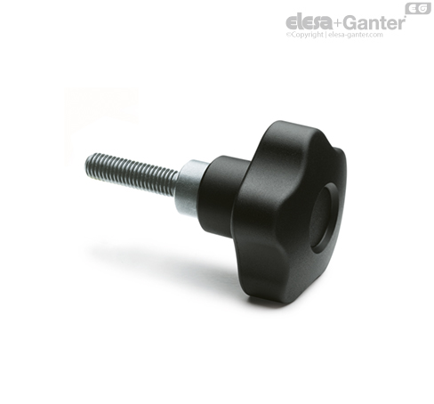 Tecnopolímero de base poliamídica (PA) reforzado con fibra de vidrio. Inserto dentado en zamac para acoplarse al elemento de fijación de metal, color negro, acabado mate.