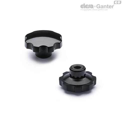Duroplástico de base fenólica (PF), color negro, acabado brillante.