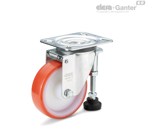 La rueda con pie antideslizamiento permite elevar carros o maquinaria para poder operar con seguridad a la vez que se garantiza la posibilidad de realizar desplazamientos frecuentes con tan solo regular el hexágono del pie, con lo que se transforman de hecho puestos y aparatos de trabajo fijos en puestos móviles.