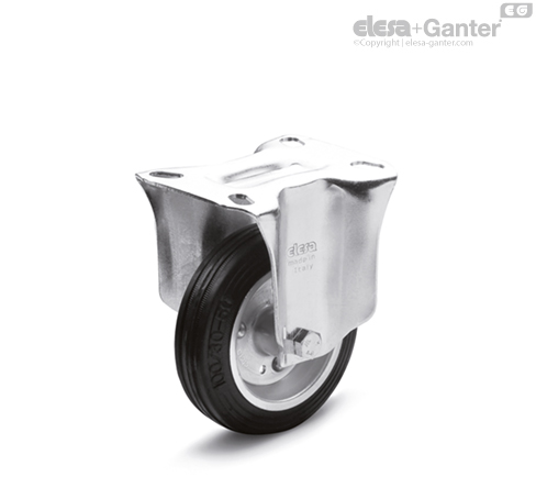 Chapa de acero galvanizado. El soporte está diseñado para soportar cargas de hasta 2300N. Los dos cojinetes y el contacto directo entre la placa y el anillo porta cojinetes con pasador integrado garantizan una excelente maniobrabilidad. No requiere mantenimiento.