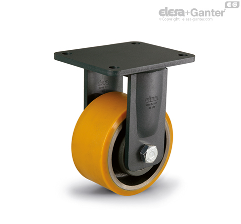 Adecuada para aplicaciones industriales pesadas y para condiciones severas de uso, tales como impactos y altas velocidades. La rueda de poliuretano colado garantiza una excelente elasticidad y gran resistencia a la rodadura, al desgaste y a la laceración. Para más información, véase rueda RE.F4.