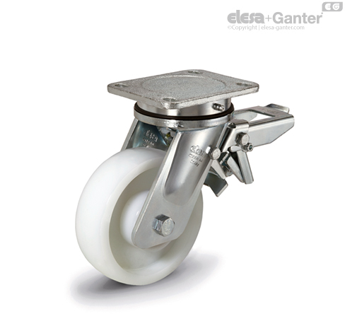 Efecto doble de bloqueo simultáneo en la rueda y el soporte. El freno es eficaz y fácil de usar: se acciona y libera moviendo simplemente de arriba a abajo la punta de dos pedales separados, garantizando así la máxima capacidad de maniobra. La eficacia de la frenada puede ajustarse mediante un tornillo de cabeza hueca M8.