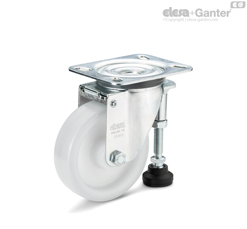 La rueda con pie antideslizamiento permite elevar carros o maquinaria para poder operar con seguridad a la vez que se garantiza la posibilidad de realizar desplazamientos frecuentes con tan solo regular el hexágono del pie, con lo que se transforman de hecho puestos y aparatos de trabajo fijos en puestos móviles.