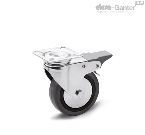 Frenado total que bloquea la rotación tanto de la rueda como del soporte, de tecnopolímero.