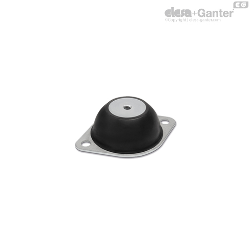 Los elementos de amortiguación para vibraciones DVE están compuestos por dos elementos metálicos unidos mediante un cuerpo de goma antivibraciones. Un elemento redondo con un inserto con un agujero pasante roscado constituye la base de fijación de la máquina vibratoria. Otro elemento, con forma ovalada o cuadrada, constituye la brida para fijarla al suelo.