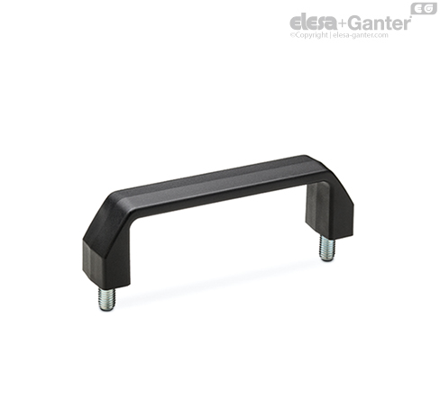 - M.543-p: Tecnopolímero de base poliamídica (PA) reforzado con fibra de vidrio, color negro o naranja, acabado mate. Espárragos roscados de acero galvanizado, extremos achaflanados según UNI 947: ISO 4753 (ver Datos técnicos).